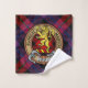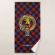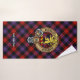 Clan Brown crest badge surrounded by a strap and buckle over tartan background. Custom text on each towel.