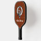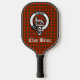 Stylish pickleball paddle features Scottish Clan Bruce crest badge and customisable text on tartan background.