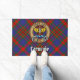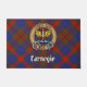 Clan Carnegie crest badge surrounded by a strap and buckle over tartan background. Custom text.