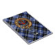 Clan Clark crest badge surrounded by a strap and buckle over tartan background. Custom text.