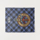 Clan Clark crest badge surrounded by a strap and buckle over tartan background. Custom text.