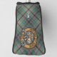 Clan Craig crest badge surrounded by a strap and buckle over tartan background. Custom text.