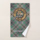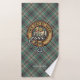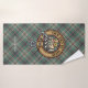 Clan Craig crest badge surrounded by a strap and buckle over tartan background. Custom text on each towel.