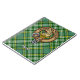 Clan Currie lion crest badge surrounded by a strap and buckle over tartan background. Custom text.