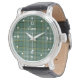 Stylish leather strap wrist watch, with the classic green clan Currie tartan plaid pattern, on the face, with white numbers and dots for the hours. White custom text reads Currie, and can be personalised to read what you want.