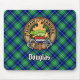 Clan Douglas crest badge surrounded by a strap and buckle over tartan background. Custom text.