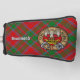 Clan Drummond crest badge surrounded by a strap and buckle over tartan background. Custom text.