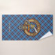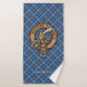 Clan Elliot crest badge surrounded by a strap and buckle over ancient tartan background. Custom text on each towel.