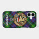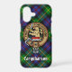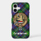Clan Farquharson crest badge surrounded by a strap and buckle over tartan background. Custom text.