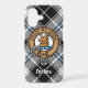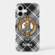 Clan Forbes crest badge surrounded by a strap and buckle over dress tartan background. Custom text.