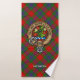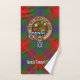 Clan Fraser crest badge surrounded by a strap and buckle over tartan background. Custom text on each towel.