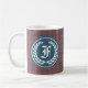 Coffee mug with the ancient clan tartan for the Fraser of Lovat family and its septs. Vintage Scottish plaid pattern in coral red, light blue and green, with white accents. Features a round light blue badge with laurels on both sides of mug with your monogram initial in an Old English font.