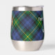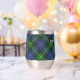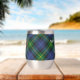 Clan Gordon crest badge surrounded by a strap and buckle over tartan background. Custom text on both sides.