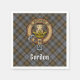 Clan Gordon crest badge surrounded by a strap and buckle over weathered tartan background. Custom text.