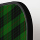 Pickleball paddle featuring Scottish Clan Gunn Crest Badge and text on tartan background.