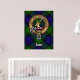 Clan Gunn crest badge surrounded by a strap and buckle over tartan background. Custom text.