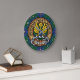 Clan Johnston crest badge surrounded by a strap and buckle over tartan background. Custom text.