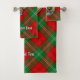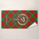 Clan Lennox crest badge surrounded by a strap and buckle over tartan background. Custom text on each towel.