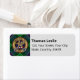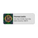 Clan Leslie crest badge surrounded by a strap and buckle over hunting tartan background. Custom text fields for name and address.