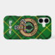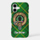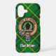 Clan MacArthur crest badge surrounded by a strap and buckle over tartan background. Custom text.