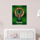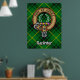 Clan MacArthur crest badge surrounded by a strap and buckle over tartan background. Custom text.