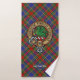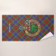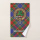 Clan MacBeth crest badge surrounded by a strap and buckle over tartan background. Custom text on each towel.