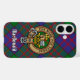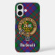 Clan MacDonald crest badge surrounded by a strap and buckle over tartan background. Custom text.