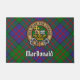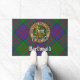 Clan MacDonald crest badge surrounded by a strap and buckle over tartan background. Custom text.