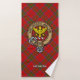 Clan MacDonald of Keppoch crest badge surrounded by a strap and buckle over tartan background. Custom text on each towel.