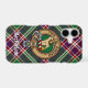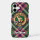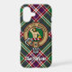 Clan MacFarlane crest badge surrounded by a strap and buckle over modern hunting tartan background. Custom text.