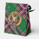 Clan MacFarlane crest badge surrounded by a strap and buckle over modern hunting tartan. Custom text and monogram.