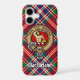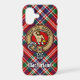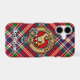 Clan MacFarlane crest badge surrounded by a strap and buckle over red tartan background. Custom text.