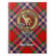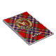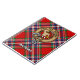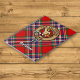 Clan MacFarlane crest badge surrounded by a strap and buckle over red tartan background. Custom text.