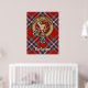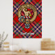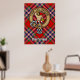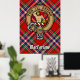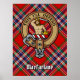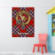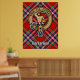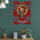 Clan MacFarlane crest badge surrounded by a strap and buckle over red tartan background. Custom text.