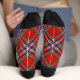 Clan MacFarlane crest badge surrounded by a strap and buckle over red tartan background. Custom top stripe colour. Custom text on each sock.