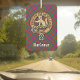 Clan MacGowan crest badge surrounded by a strap and buckle over tartan background. Custom text on both sides.