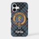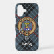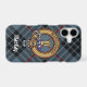 Clan MacKay crest badge surrounded by a strap and buckle over blue tartan background. Custom text.