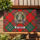 Clan MacLean crest badge surrounded by a strap and buckle over tartan background. Custom text.