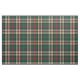 Fabric in the hunting tartan for Clan MacNeish, a traditional Scottish plaid pattern dated to 2009 in tan, forest green, and black, with red accents. Pattern repeats every 4". Special order smaller or larger scale via https://plaidwerx.com/contact.htm