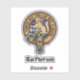 Clan MacPherson crest badge surrounded by a strap and buckle over blue dress tartan background. Custom text.
