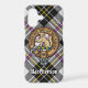 Clan MacPherson crest badge surrounded by a strap and buckle over dress tartan background. Custom text.