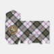 Clan MacPherson crest badge surrounded by a strap and buckle over dress tartan. Custom text and monogram.