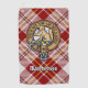 Clan MacPherson crest badge surrounded by a strap and buckle over red dress tartan background. Custom text.
