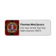 Clan MacQueen crest badge surrounded by a strap and buckle over tartan background. Custom text fields for name and address.
