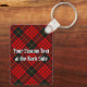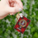 Clan MacQueen crest badge surrounded by a strap and buckle over tartan background. Custom text on both sides.