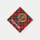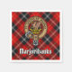 Clan Marjoribanks crest badge surrounded by a strap and buckle over tartan background. Custom text.