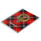 Clan Marjoribanks crest badge surrounded by a strap and buckle over tartan background. Custom text.