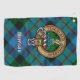 Clan Morrison crest badge surrounded by a strap and buckle over hunting tartan background. Custom text.
