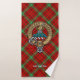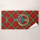 Clan Morrison crest badge surrounded by a strap and buckle over red tartan background. Custom text on each towel.
