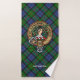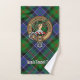 Clan Paterson crest badge surrounded by a strap and buckle over tartan background. Custom text on each towel.
